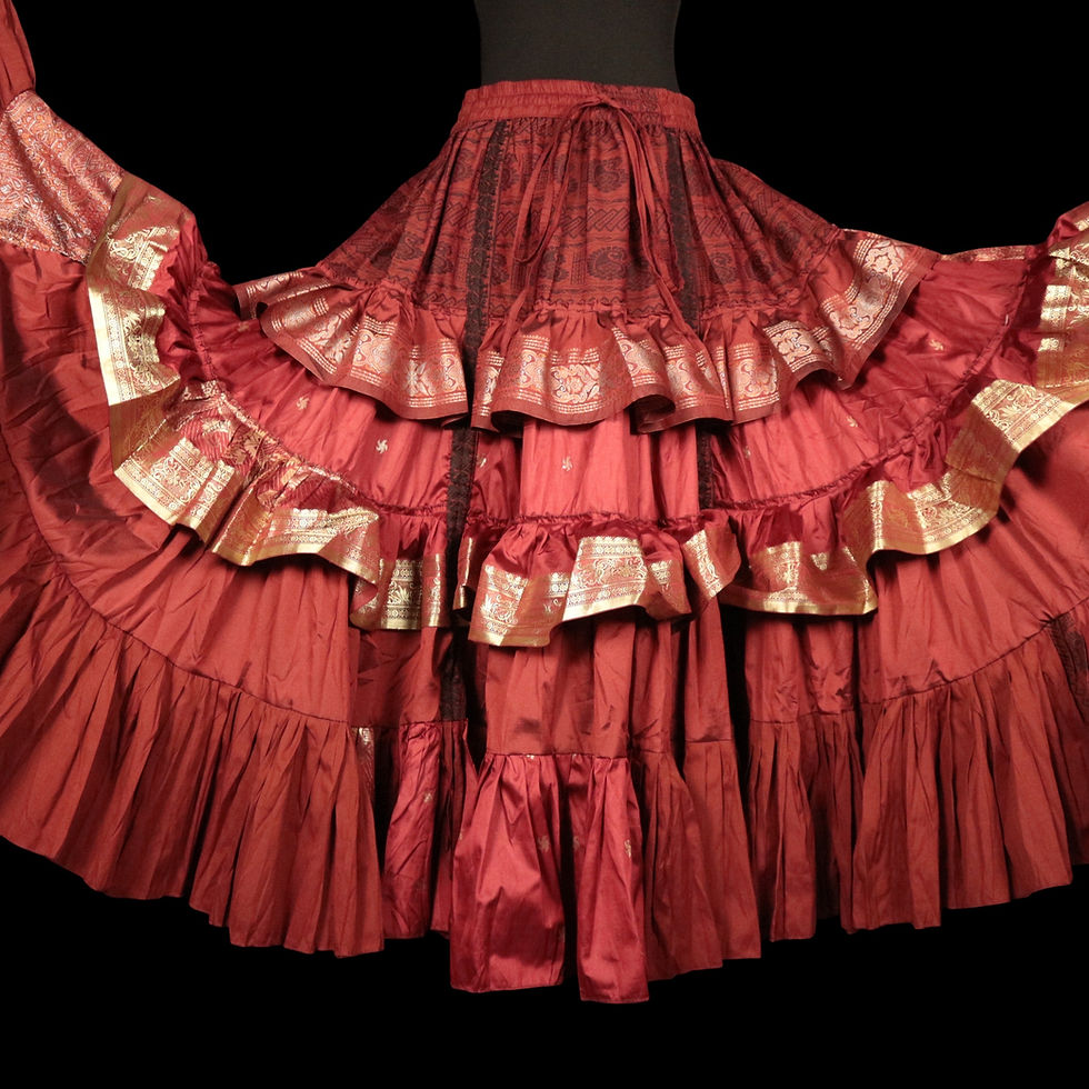 Our Tempest Skirts are made from Antique Silk and embellished with fine gold, silver and copper threads. Our gorgeous fabric is up-cycled from silk that once adorned an Indian bride on her wedding day. On occasion the silk may have small signs of wear that show the beauty of its age. We photograph anything we notice. Flame retardant so great for fire performers. Each piece is completely unique and comes in a reusable stylish cotton Barocco bag.