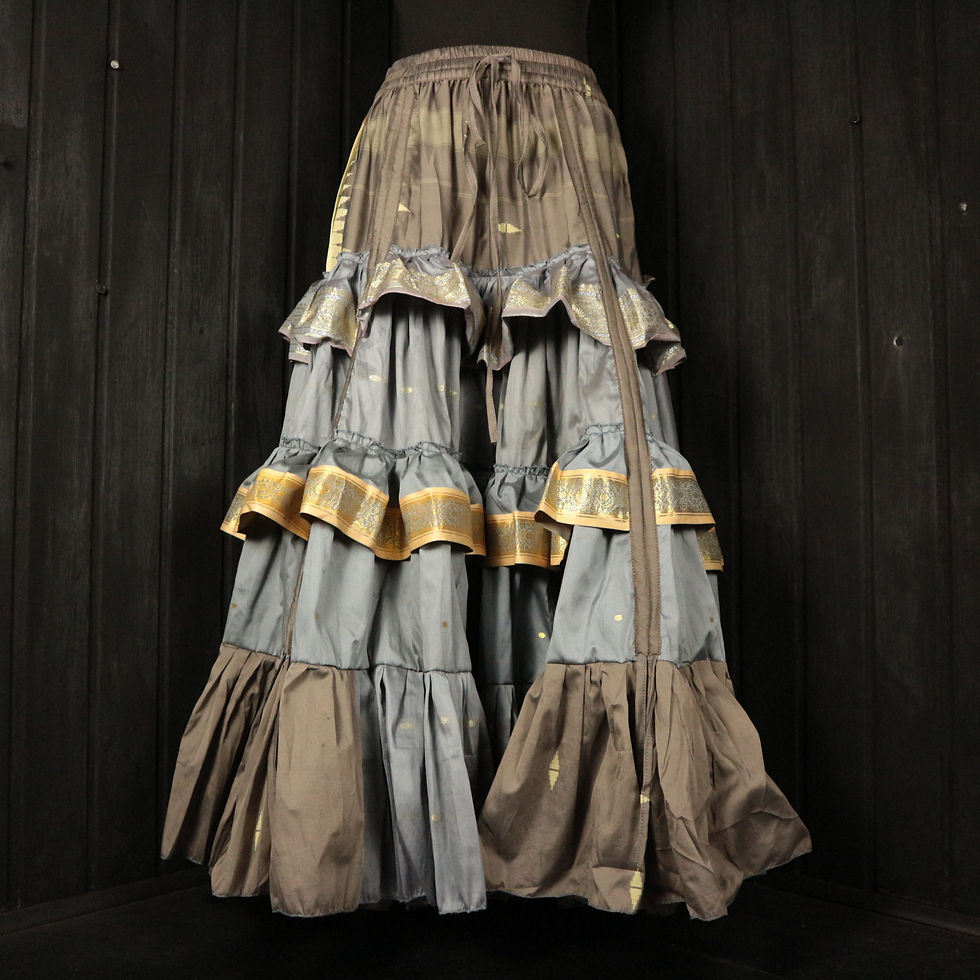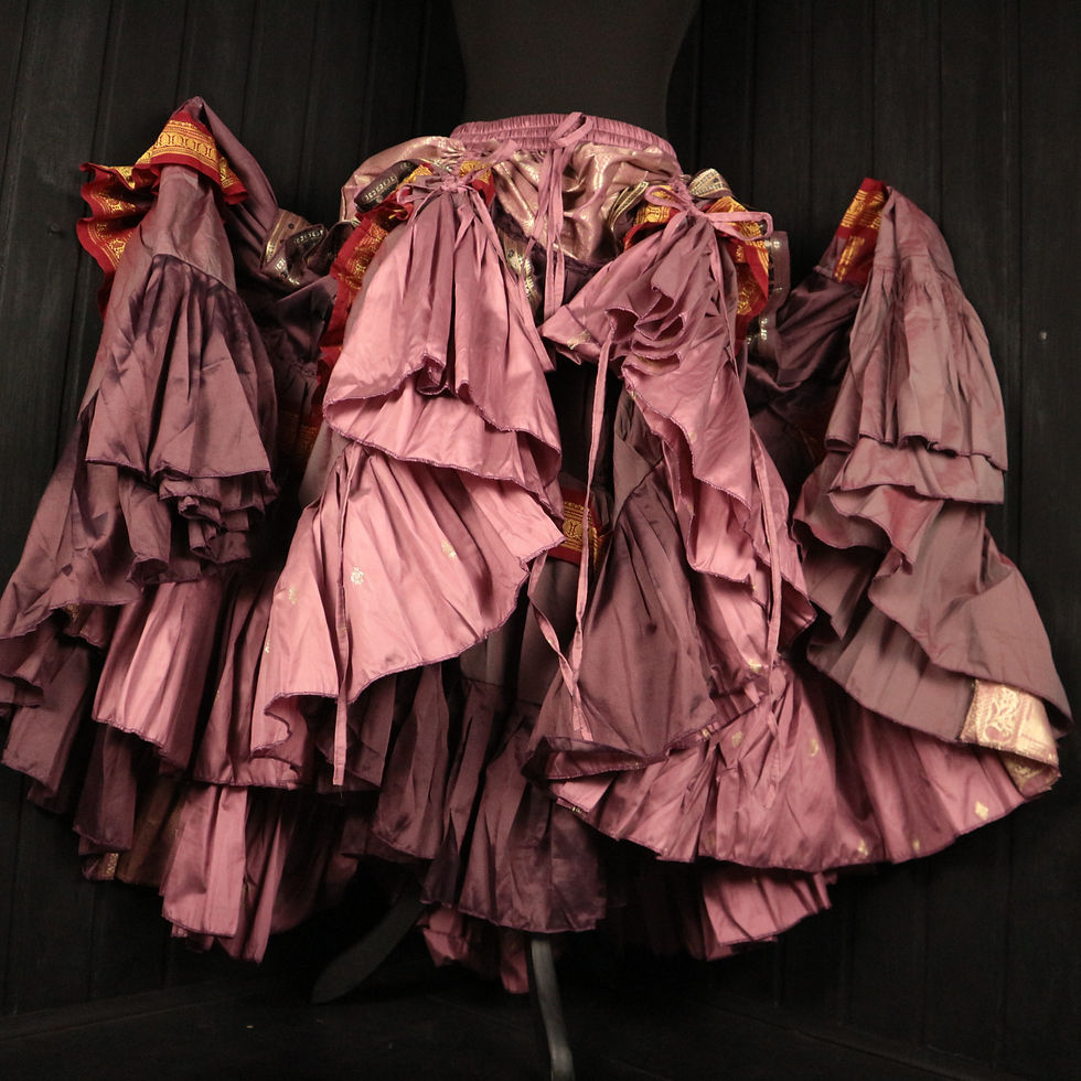 Our Mistral Skirts are made from antique silk-sari and embellished with fine gold, silver and copper threads.  Our gorgeous fabric is up-cycled from silk that once adorned an Indian bride on her wedding day.  On occasion the silk may have small signs of wear that show the beauty of its age.  We photograph anything we notice.  Flame retardant so great for fire performers.  Each piece is completely unique and comes in a reusable stylish cotton Barocco bag.