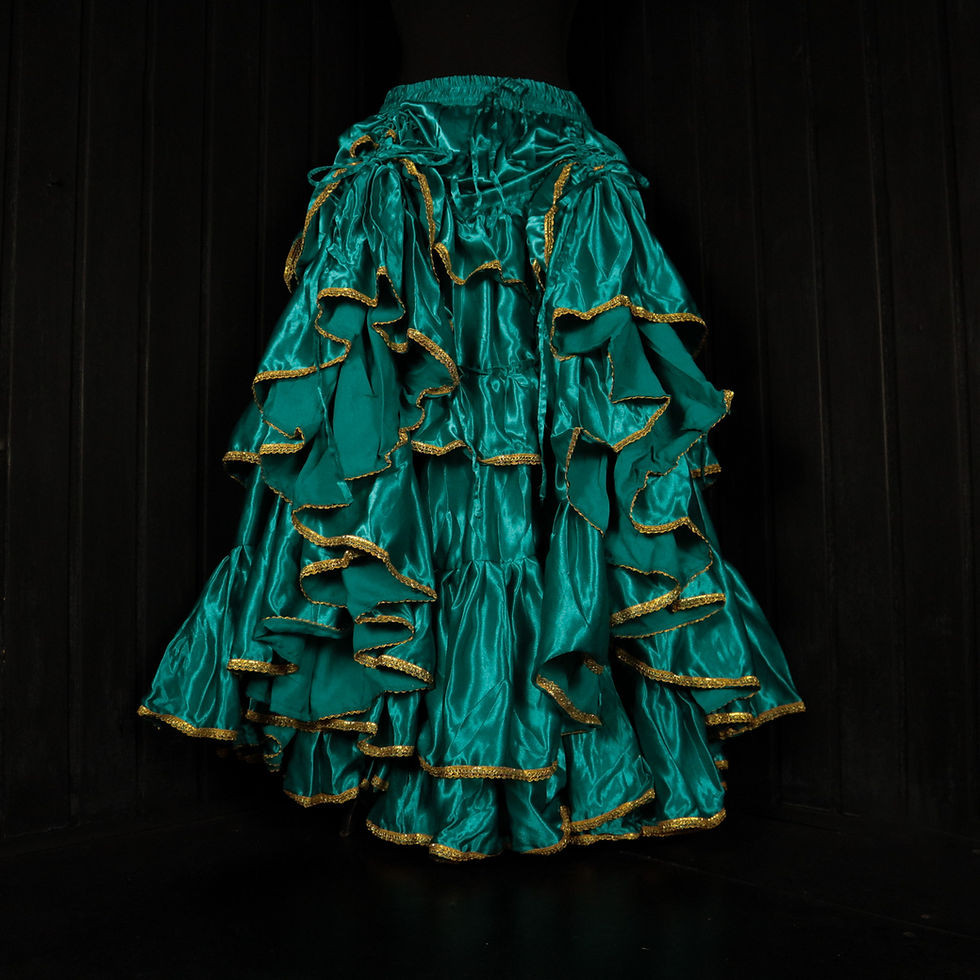 The Original Vagabond skirt. Flouncy and floaty, yet heavy and full, these handmade 23 yard frilled skirts swish and swirl beautifully when you move. A clever design detail means that the skirts can be ruched at the front for a versatile gathered look, or left unruched to show off the frills and layers of sumptuously soft satin or shimmering silk in their full-length glory.